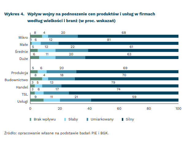 zjawisko częściej występuje w mniejszych firmach. Aż 81 proc. małych przedsiębiorstw tłumaczy podniesienie cen silnym wpływem wojny w Ukrainie. W dużych i średnich przedsiębiorstwach nieco ponad 60 proc. Małe firmy, częściej niż duże, korzystają z pośredników handlowych co sprawia, że silniej odczuwają negatywne skutki konfliktu, który