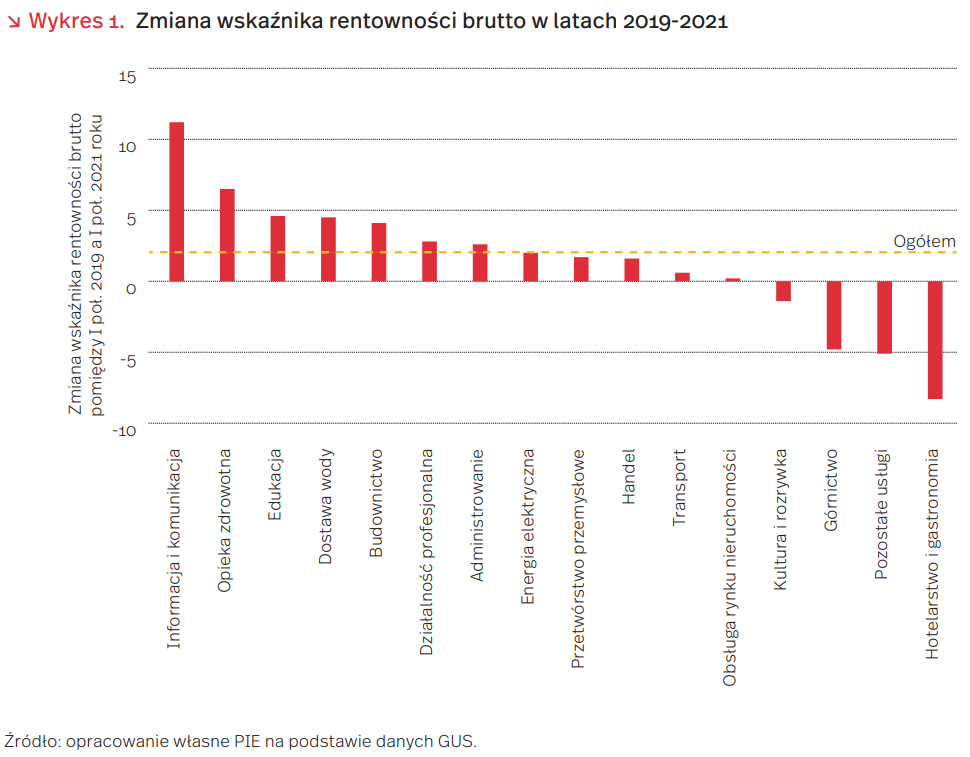 Liderem jest branża informacji i komunikacji, w której wskaźnik rentowności wzrósł w ostatnich dwóch latach z 8,8 proc. do 20,0 proc. w 2021 r. Wysokie wzrosty notujemy także w opiece zdrowotnej i społecznej (z -0,7 proc. do 5,8 proc.) oraz edukacji (z 9,1 proc. do 13,7 proc.). Niestety, wyniki finansowe w branżach najmocniej dotkniętych przez pandemię (hotelarstwo, gastronomia, część usług) nie uległy poprawie.
