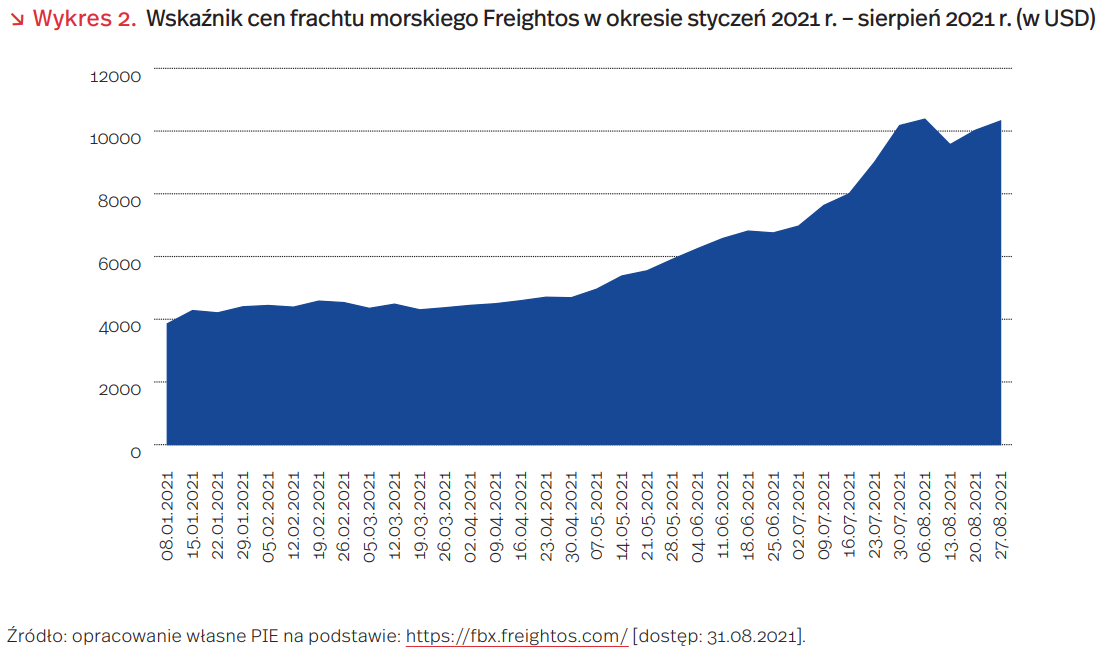 Rozprzestrzenianie się wariantu Delta powoduje problemy z transportem morskim, które silnie wpływają na całą światową gospodarkę. Drogą morską odbywa się ok. 80 proc. światowego handlu w ujęciu ilościowym i ok. 70 proc. w ujęciu wartościowym (wg UNCTAD). W ostatnich miesiącach doszło do czasowych zamknięć m.in. drugiego co do wielkości chińskiego terminalu Yantian (w końcu maja) oraz części portu Ningbo-Zhoushan na wschodnim wybrzeżu Chin (w sierpniu) po wykryciu zakażenia wariantem Delta u jednego z pracowników. Port Ningbo-Zoushan jest trzecim co do wielkości portem na świecie po portach w Szanghaju i w Singapurze. Ograniczenia przepustowości chińskich portów powodują lawinę perturbacji oraz zakłócenia obiegu i dostępności kontenerów i statków handlowych w innych miejscach świata. Przekłada się to bezpośrednio na ceny transportu. Indeks cen frachtu Freightos pokazuje, że tylko od początku lipca 2021 r. ceny morskich przewozów kontenerowych wzrosły półtorakrotnie, a od początku 2020 r. – już ponad siedmiokrotnie (wykres 2).