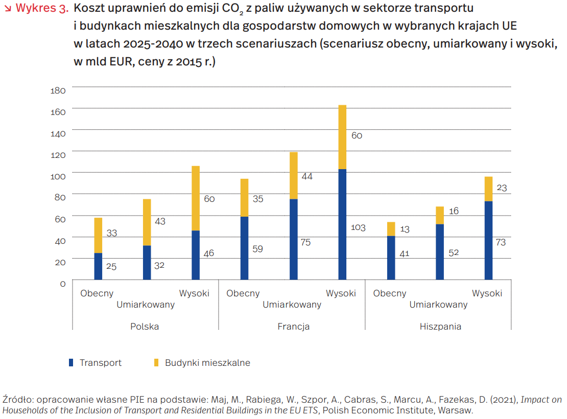 Szacowana całość wpływu z nowego mechanizmu ETS dla transportu i budynków mieszkalnych w latach 2025-2032 wyniosłaby więc 289 mld EUR. Zakładając podobne przychody w latach 2033-2040 ostateczna kwota przekroczyłaby 600 mld EUR. Jest to zgodne z jednym ze scenariuszy PIE („scenariusz obecny”), w którym łączne wydatki UE-27 w latach 2025-2040 z tytułu nowego systemu emisji do uprawnień CO2 w sektorze transportowym miałyby wynieść 361 mld EUR, natomiast w sektorze budynków mieszkalnych 272 mld EUR. Należy jednak zaznaczyć, że w latach 2033-2040 ceny uprawnień do emisji CO2 najprawdopodobniej znacząco wzrosną, co może przybliżyć finalny koszt do scenariusza umiarkowanego PIE (800 mld EUR).