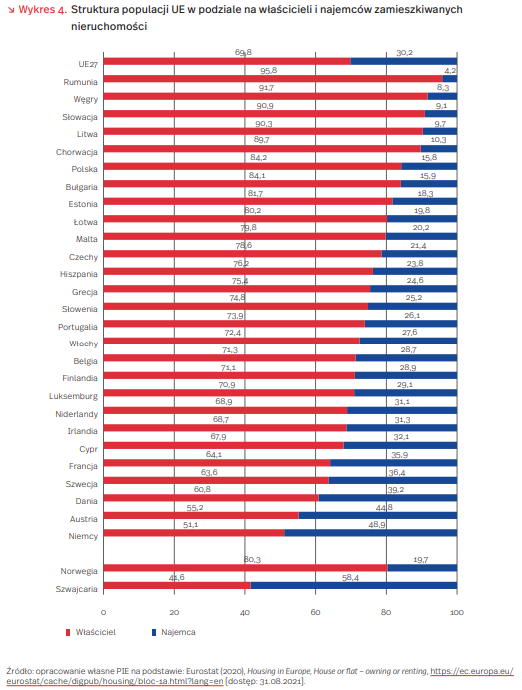 Problem drogiego wynajmu jest szczególnie dotkliwy w krajach Europy Zachodniej, ponieważ wynajmowane mieszkania stanowią tam znacznie większy odsetek niż w krajach nowej UE. Wykres 4 obrazuje, że rekordzistą jest Szwajcaria, w której blisko 60 proc. populacji wynajmuje mieszkania. W UE przodują pod tym względem Niemcy (blisko 50 proc.), podczas gdy w Polsce w wynajmowanych lokalach mieszka niespełna 16 proc., a w Rumunii tylko ok. 4 proc. ludności. Społeczne poparcie dla ograniczeń cen najmu wynika też w dużej mierze z tego, że w krajach zachodnich nieruchomościami na wynajem zarządzają przede wszystkim firmy, a nie właściciele indywidualni, którzy np. w Niemczech stanowią jedynie 5 proc. rynku.