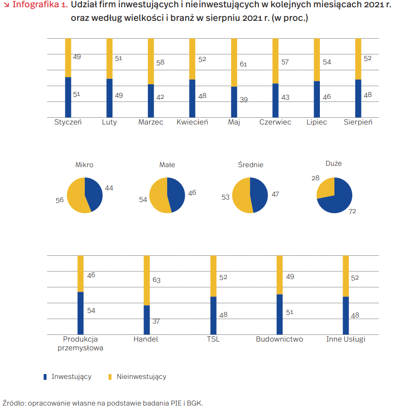 Wyniki analizy pozwalają wnioskować, że mimo niepewności i podwyższonego ryzyka, firmy zaczęły inwestować, wychodząc tym samym z okresu załamania wydatków inwestycyjnych, będącego skutkiem pandemii COVID-19. Eksperci PIE przewidują, że wzrost sprzedaży i rosnąca liczba nowych zamówień będą zachęcać przedsiębiorstwa do ponoszenia wydatków inwestycyjnych. Nadal rosnąć będą nakłady na maszyny i urządzenia techniczne, co wiąże się z przyspieszoną cyfryzacją firm i rozwojem nowoczesnych środków komunikacji. Natomiast na poziom wydatków inwestycyjnych na środki transportu wpływ będzie miał rozwój e-handlu oraz eksportu.
