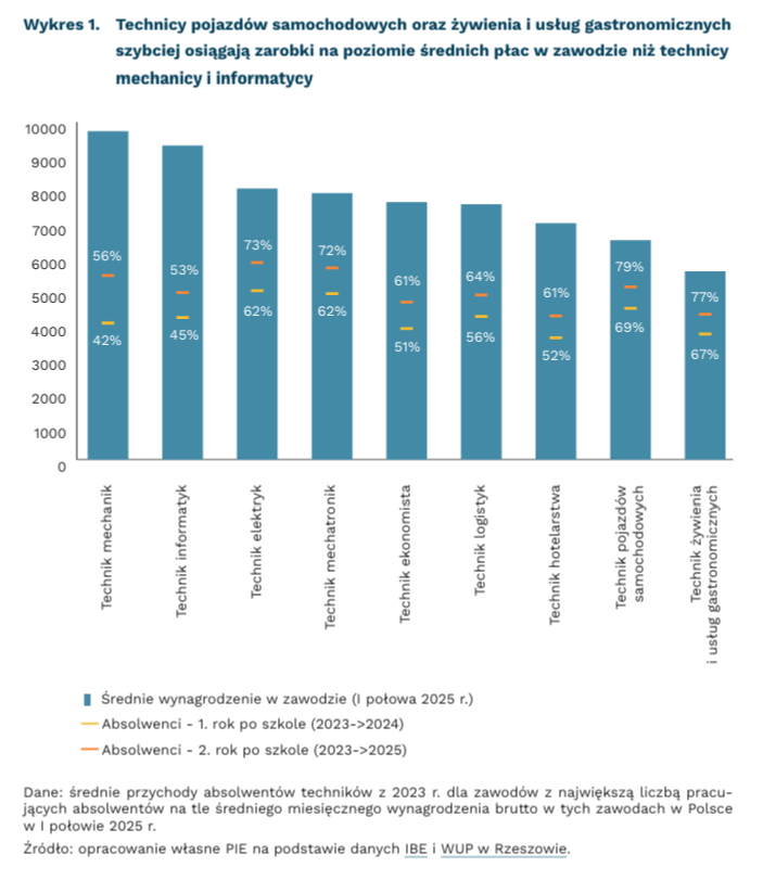 Wynagrodzenia absolwentów techników różnią się wyraźnie między zawodami. Na najwyższe zarobki mogą potencjalnie liczyć technicy mechanicy (9,7 tys. PLN brutto) i informatycy (9,3 tys. PLN brutto). Natomiast najszybciej do średniej płacy w zawodzie dochodzą technicy pojazdów samochodowych oraz żywienia i usług gastronomicznych. Po dwóch latach od zakończenia szkoły zbliżają się do 80 proc. średniego wynagrodzenia w zawodzie. Tymczasem w przypadku techników mechaników i informatyków zarobki pod dwóch latach przekraczają tylko połowę średniego wynagrodzenia w zawodzie.