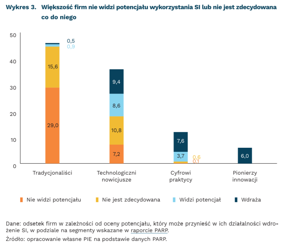 Firmy działające w Polsce wciąż w większości nie są gotowe na wdrażanie rozwiązań z zakresu sztucznej inteligencji (SI) – niedawno opublikowane wyniki badań PARP i UJ potwierdzają dotychczasowe dane dotyczące cyfryzacji polskiej gospodarki. Tylko 23 proc. badanych firm, reprezentujących 12 branż o teoretycznie największym potencjale wdrażania SI, korzysta z tych technologii, a aż 37 proc. nie widzi w ogóle potencjału do wykorzystania tej technologii.