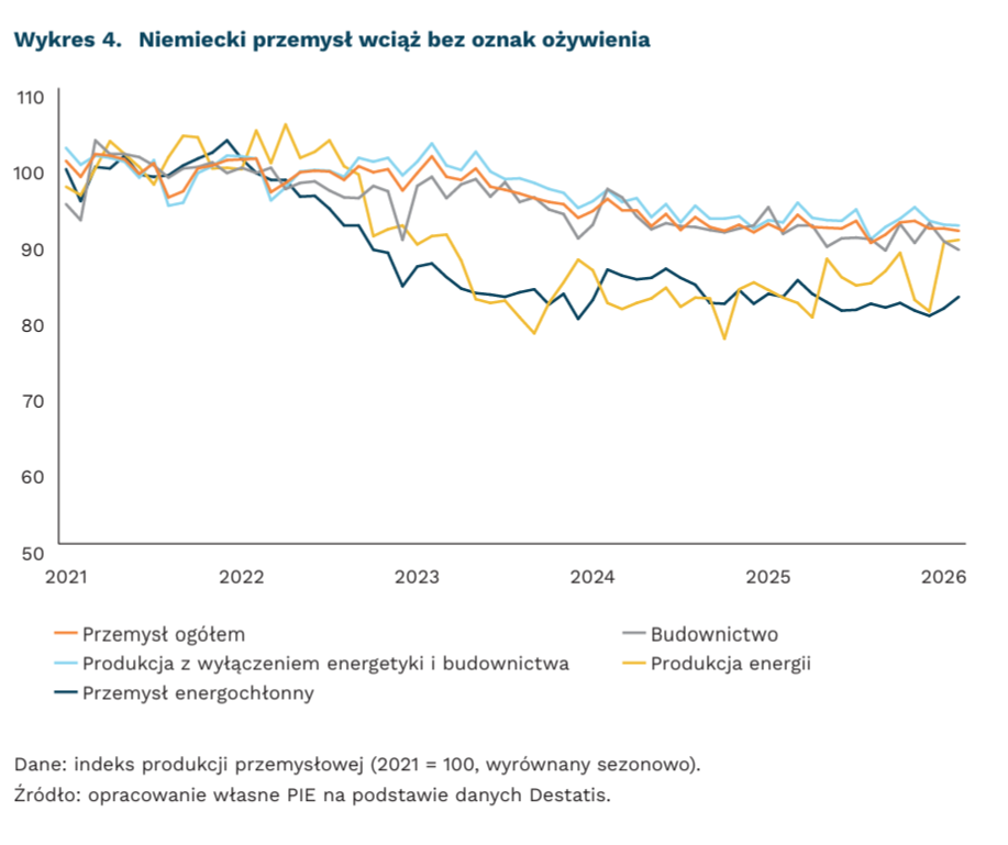 W wyniku eskalacji konfliktu na Bliskim Wschodzie prognozy gospodarcze dla Niemiec uległy pogorszeniu. Rząd obniżył oczekiwany wzrost PKB do 0,5 proc. w 2026 r. i 0,9 proc. w 2027 r., odpowiednio z 1 proc. i 1,3 proc. Powodem rewizji jest przede wszystkim nowy szok energetyczny. Wojna w Iranie spowodowała podwyżkę cen ropy i gazu, a Niemcy, mimo transformacji energetycznej, wciąż są szczególnie wrażliwe na koszty energii. Jednocześnie tradycyjny motor niemieckiej gospodarki, czyli przemysł, pozostaje słaby: produkcja przemysłowa w lutym 2026 r. spadła m/m o 0,3 proc., a w ujęciu trzymiesięcznym o 0,4 proc. Choć wartość zamówień przemysłowych wzrosła w lutym o 0,9 proc., to było to odbicie po bardzo silnym spadku o 11,1 proc. w styczniu, co nie świadczy jeszcze o trwałej poprawie. Pogarszające się nastroje przedsiębiorstw potwierdza również indeks klimatu biznesowego Ifo, który obniżył się w kwietniu do 84,4 pkt., osiągając najniższy poziom od maja 2020 r.