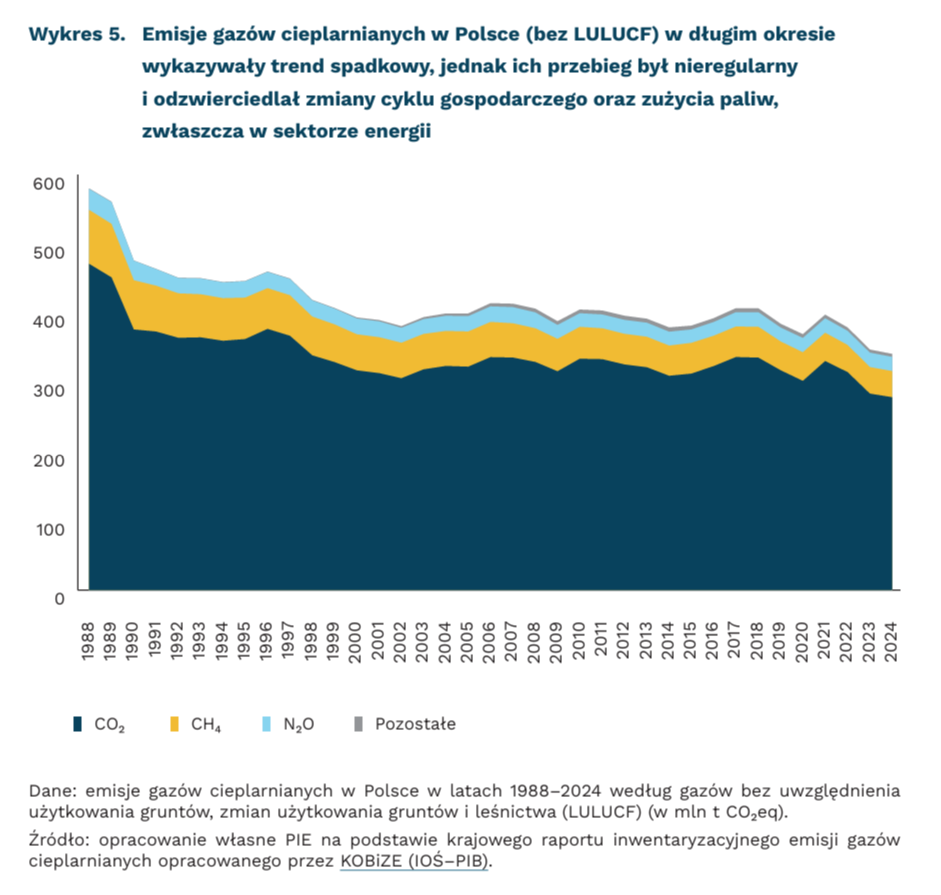 W porównaniu z 1988 r., tj. pierwszym rokiem tego typu pomiarów w Polsce, emisje w 2024 r. były niższe o 40,6 proc. Spadek emitowanych gazów cieplarnianych wpisuje się w długoterminowy trend ograniczania zużycia paliw kopalnych w sektorach energetycznych i przemysłowych. Był on zapoczątkowany transformacją gospodarczą, a w ostatnich latach wzmacniany przez politykę klimatyczną UE i wynikającą z niej transformację energetyczną, w tym modernizację jednostek wytwórczych.