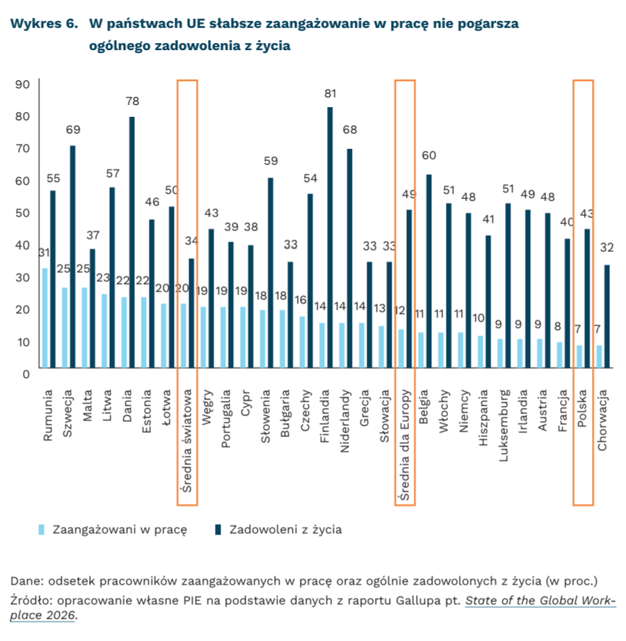 Poziom zaangażowania pracowników w Polsce należy do najniższych w Europie i na świecie. Z danych najnowszego raportu Gallupa pt. State of the Global Workplace 2026 wynika, że w Polsce tylko 7 proc. pracowników deklaruje wysokie zaangażowanie w pracę. To jeden z dwóch najniższych wyników w Europie, podczas gdy średnia europejska wynosi 12 proc., a globalna – 20 proc. Co ciekawe, jednocześnie aż 43 proc. Polaków deklaruje ogólną satysfakcję z życia (średnia dla Europy to 49 proc., dla świata – 34 proc.), 57 proc. uważa, że koniunktura dla poszukiwania pracy jest dobra, a tylko 6 proc. ma poczucie osamotnienia. Ten ostatni wskaźnik wynosi w Europie średnio 13 proc. a na świecie – średnio 22 proc.