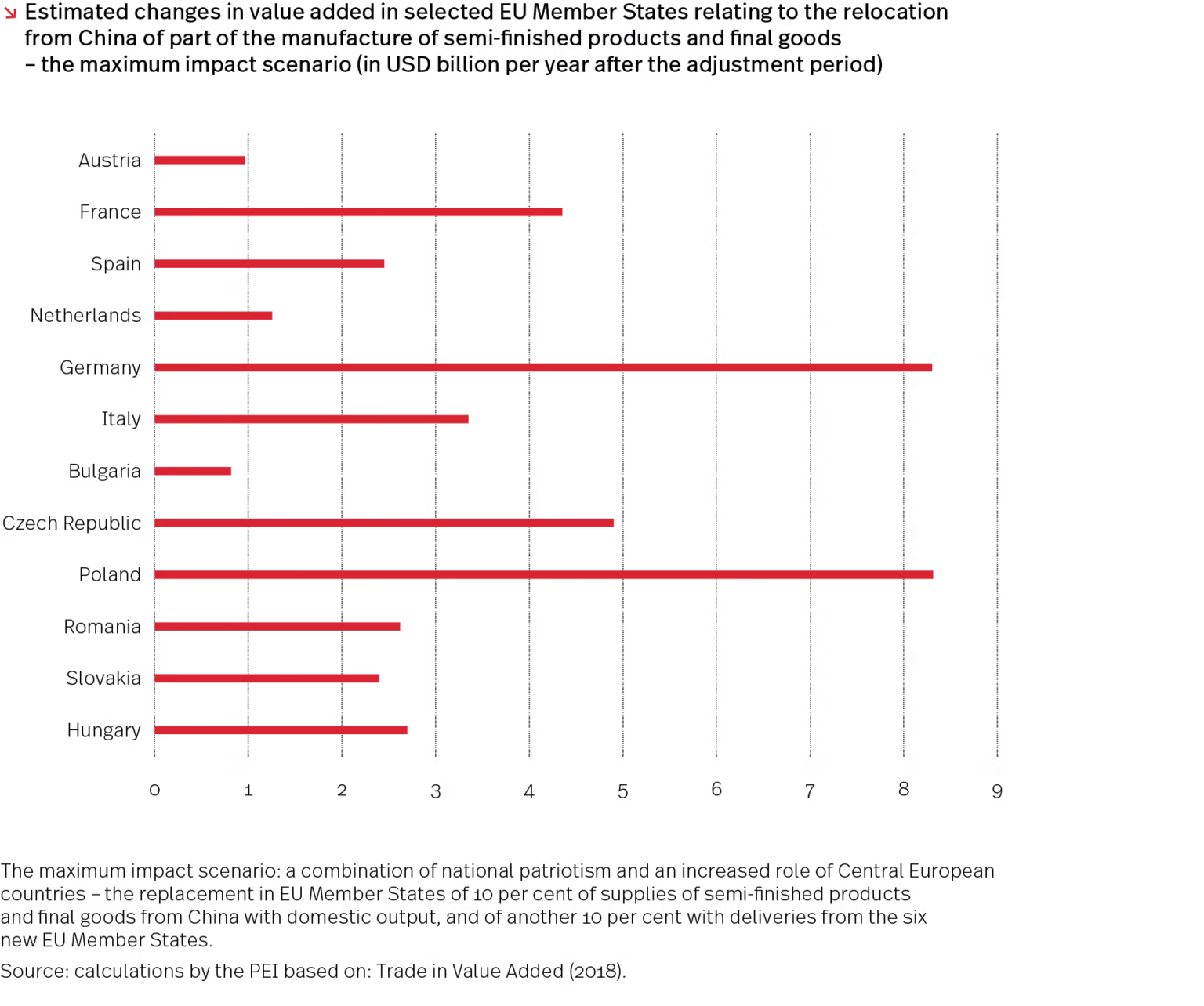 The arrangement of beneficiaries of production delocation from China depends on the assumptions adopted in specific scenarios. The EU Member States would benefit the most from a combination of national patriotism and the strengthening of new Member States from Central Europe (the Czech Republic, Poland, Slovakia, Hungary, Romania and Bulgaria) in their capacity as factories for the EU. In addition to Poland (USD 8.3 billion), other major beneficiaries in the region would be the Czech Republic (USD 4.9 billion), Hungary (USD 2.7 billion) and Romania (USD 2.6 billion).