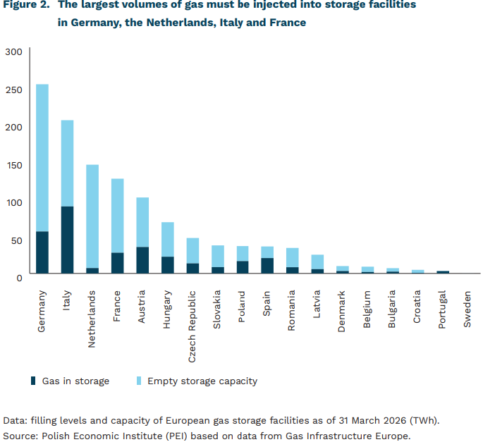 Low temperatures in January and February led to a rapid drawdown of gas from European storage facilities. According to data from Gas Infrastructure Europe, in January 2026, gas levels fell by as much as 240 TWh – since 2011, deeper monthly declines have only been recorded in January 2017 and 2021. However, a warm March brought some relief. In Poland, the impact of the winter was slightly less pronounced due to the smaller role of natural gas in district heating, domestic heating and electricity generation. Our storage facilities are currently around 45% full.