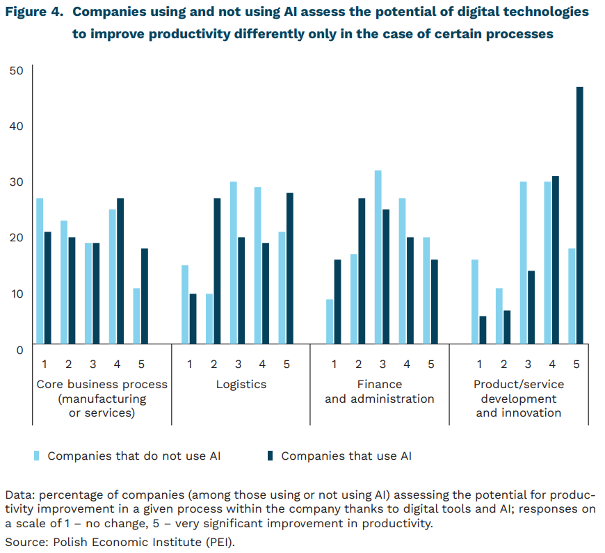 The difference in the assessment of the usefulness of digital tools for product and service development between companies using and not using AI was the highest of all the areas surveyed – it amounted to as much as 0.83 points. At the same time, as many as 46 per cent of companies already using AI indicated that digital tools can improve the productivity of this process to a very large extent. This result may be indicative of the potential of digital technologies as revealed in the day-to-day operations of companies. At the same time, given the low level of digital technology adoption in Poland as a whole, it may suggest a growing divide amongst businesses. The group that is quicker to embrace digital transformation, utilising new tools to create productivity-enhancing innovations, will increasingly stand out from other companies. Conversely, a significant difference in the opposite direction, in the case of financial processes, may stem from a certain disappointment with the promises behind AI – perhaps the results achieved in this area (accounting, controlling, internal communication) have not met expectations.