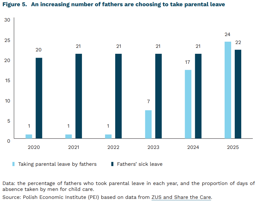 In 2025, the percentage of fathers who took parental leave was 24%, marking a record high and a 7 percentage point increase compared to 2024. The proportion of fathers taking parental leave has been steadily increasing since 2023, when the EU Work-Life Balance Directive was implemented into Polish law. It granted each parent the right to 9 weeks of parental leave, with the stipulation that this right cannot be transferred to the other parent. In practice, this means that if the father does not take the leave, the child’s mother cannot take it.