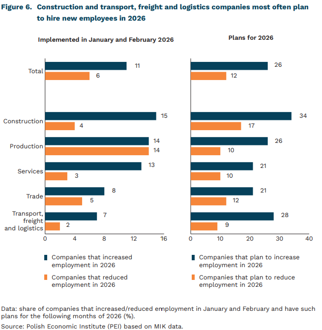 More than one-third of construction companies plan to increase employment in 2026. This is due to the seasonality of the sector – during the spring and summer period, workers performing construction work are more in demand than in other parts of the year. Transport, freight and logistics companies also often declare plans to hire new employees (28%). Both of these sectors far more often than others indicated that problems with the availability of workers hinder their operations. According to the March MIK reading, as many as 58% of construction companies and 59% of transport, freight and logistics companies reported that labour shortages are of major or very major importance for their functioning.