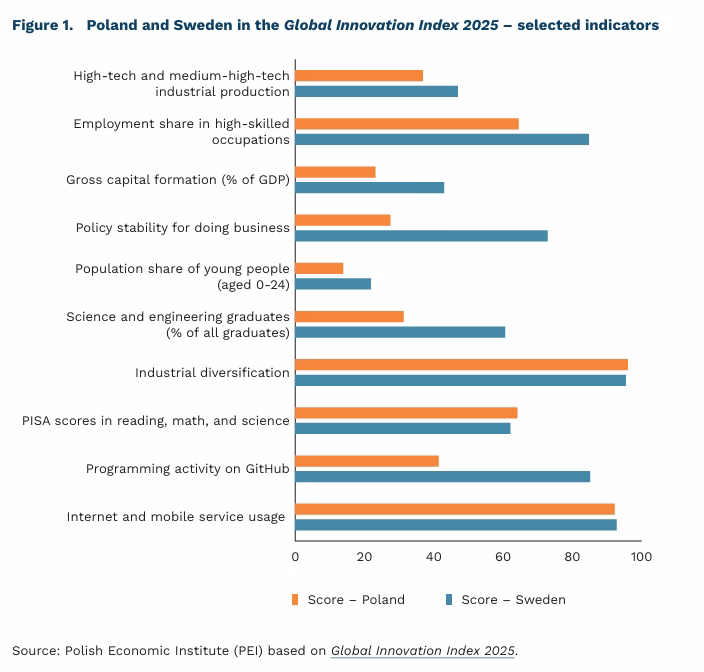 Poland ranked 39th in the 2025 edition of the Global Innovation Index (GII), published by the World Intellectual Property Organization (WIPO). The index aims to provide a comprehensive picture of innovation, capturing social transformation, shifts in business models, institutional organisation, and technological progress. Poland was placed just behind India and ahead of Croatia, Lithuania, Greece, and Turkey. Switzerland topped the ranking for the fifth consecutive year (2021-2025), followed by Sweden, the United States, South Korea, and Singapore. From a regional perspective, Europe remains the leading area, with 15 European economies ranked among the world’s 25 most innovative, including six in the top 10.
