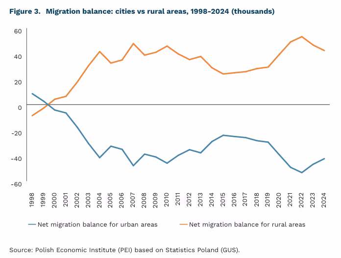 Cities recorded a positive migration balance only in 1998 and 1999 (+8,500 and +2,700 people, respectively). The lowest negative balance was noted in 2022 (-53,300), while rural areas posted a record-high positive balance (+53,300). This was likely driven by lifestyle and work changes accelerated by the COVID-19 pandemic, although the pandemic merely catalysed a pre-existing trend of migration from cities to rural areas.