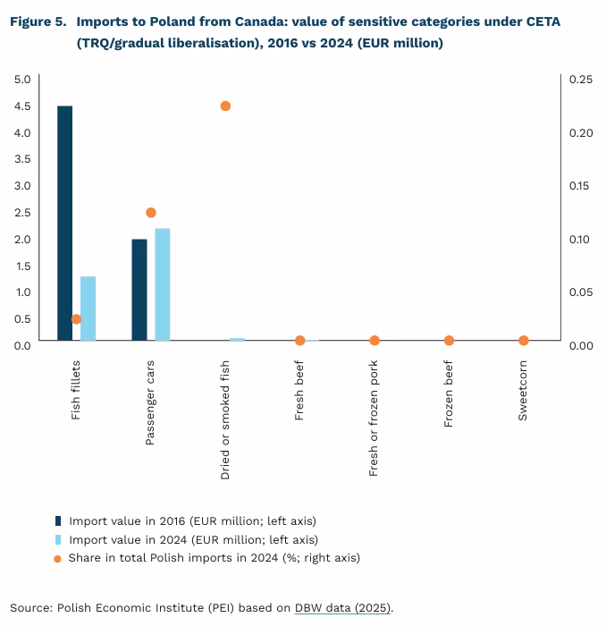 In foreign direct investment (FDI) on both sides of the Atlantic, the scale has grown, though CETA’s impact remains moderate and uneven. EU FDI in Canada increased by an average of EUR 40 billion annually (from EUR 220bn to EUR 260bn), while Canadian FDI in the EU grew by EUR 44 billion (from EUR 166bn to EUR 210bn). However, Canada’s share in the EU’s investment portfolio has declined, as US and Chinese investment destinations have expanded even faster. The limited effect on FDI partly reflects the fact that CETA’s key investment provisions are still awaiting ratification by 10 EU member states. At the same time, Poland and Canada are bound by a bilateral investment protection agreement.