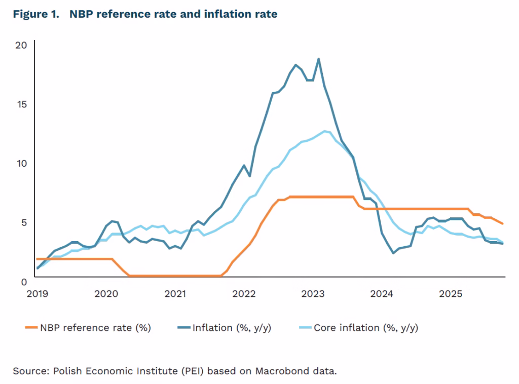 Interest rates down, inflation within the NBP target range. In November, the Monetary Policy Council (MPC) cut interest rates by 25 basis points to 4.25%, marking the fourth consecutive reduction and effectively continuing the easing cycle. However, the Council continues to describe its actions as an ‘adjustment of the interest rate level’, avoiding the term ‘monetary policy easing’. The November decision was supported by lower-than-expected inflation data – the flash CPI estimate for October stood at 2.8% y/y versus the forecast of 3.0%. Importantly, core inflation (excluding food and energy prices) is estimated at around 2.9%. If confirmed by the NBP, this would be the lowest level in six years, since November 2019.