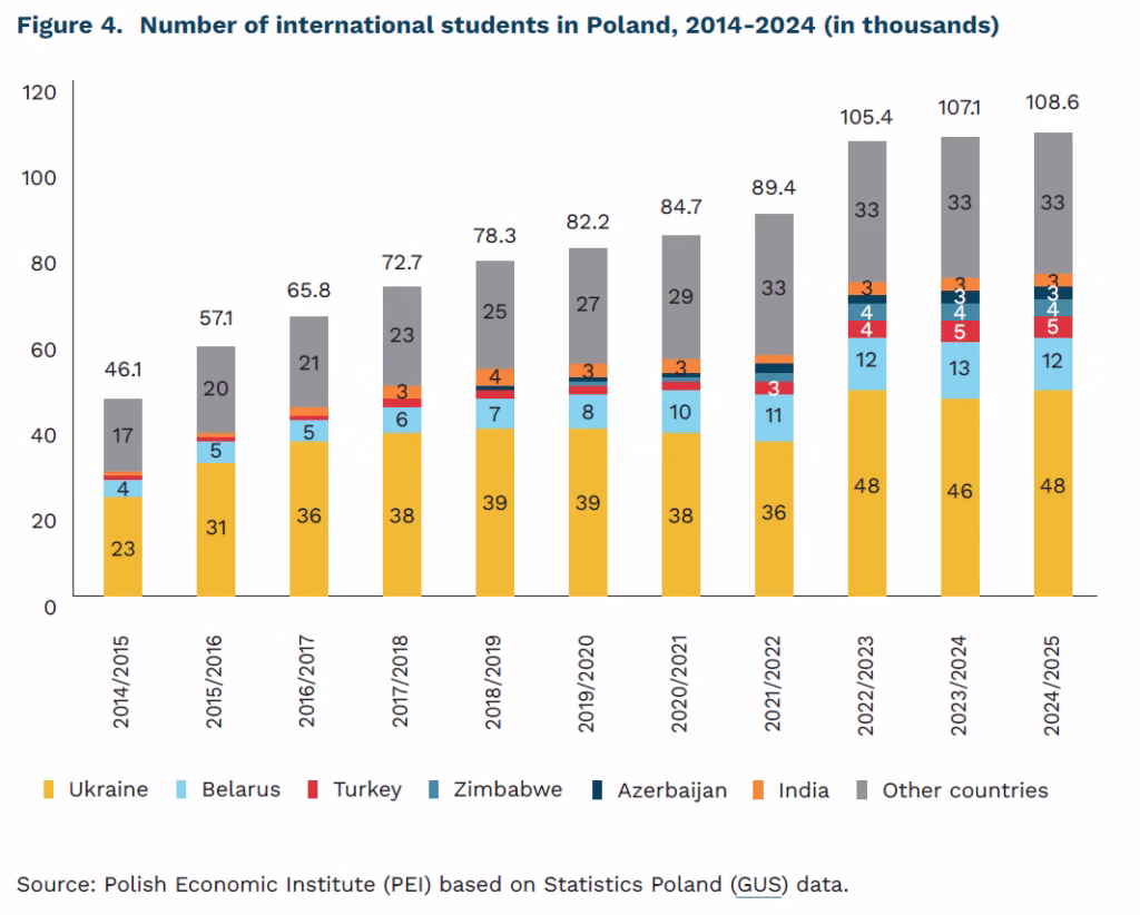 Over the last ten years, the composition of Poland’s international student body has evolved significantly. In 2014/2015, apart from Ukrainians and Belarusians, most came from other European countries. Today, there is a marked rise in students from Asia (India, Azerbaijan, China, Uzbekistan) and Africa (especially Zimbabwe and Nigeria). Meanwhile, the share of students of Polish origin exempt from tuition fees at public universities has been steadily falling – from 13.5% a decade ago to just 5.1% today.