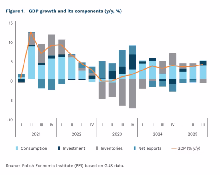 Poland’s economic growth is accelerating once again. According to Statistics Poland’s (GUS), latest estimate, real GDP increased by 3.8% y/y in Q3, compared with 3.3% in Q2. The result is 0.1 pp higher than the flash estimate. Private consumption remained the main growth driver, rising by 3.5% y/y. This marks a slowdown from 4.5% in Q2, most likely due to an increase in household savings. Investment surged strongly, accelerating to 7.1% y/y from -0.7% in the previous quarter. For the first time in over a year, net exports contributed positively to GDP growth, despite higher import dynamics partly driven by the high import intensity of investment.