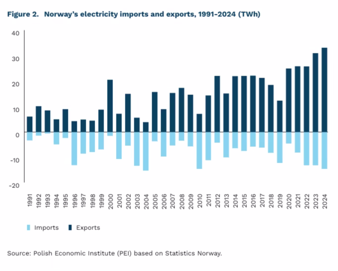 German demand pushes up prices in interconnected markets. During periods of low solar and wind generation (the so-called “dark doldrums”), German industry purchases electricity from neighbouring systems, including Norway’s hydropower plants. Norway’s average annual electricity exports increased from 8.1 TWh in 1991-2000 to 28.1 TWh in 2020-2024.