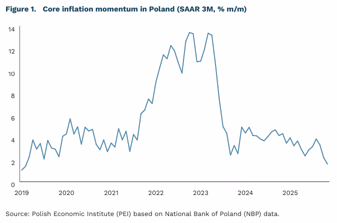 The past year in the Polish economy was marked by a transition from fighting inflation to a phase of cautious stabilisation. The Monetary Policy Council (MPC) cut interest rates six times, by a total of 175 basis points. These decisions were made possible primarily by a clear easing of inflationary pressures, reflected in the decline in year-on-year CPI inflation from 4.9% in January to 2.5% in November, as well as by improved inflation outlooks in forecasts. In recent months, CPI inflation has consistently surprised on the downside, coming in below market consensus. Core inflation, excluding food and energy prices, also fell year on year to 2.7% in November, while its momentum (SAAR 3M(1)) dropped to 1.6%, falling below 2% for the first time since February 2019. It should be noted, however, that the full impact of the current interest rate cuts on price dynamics will materialise with a significant lag, estimated at around 8-9 quarters.