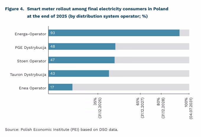 The ongoing nationwide rollout in Poland constitutes the implementation of Directive (EU) 2019/944 of the European Parliament and of the Council. In Poland, targets for smart meter rollout were introduced through a 2021 amendment to the Energy Law Act. Under its provisions, DSOs are required to provide smart meters to all final electricity consumers by 4 July 2031. The law also defines interim milestones: 35% by 31 December 2025, 65% by the end of 2027, and 80% by the end of 2028. The replacement of meters does not entail any direct costs for electricity consumers – DSOs cover the costs of both the device and installation.