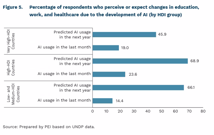 One of the key challenges highlighted in the UNDP report is the need to build a ‘complementary economy’ in which AI enhances rather than replaces human labour. Across countries with low, medium, and high HDI, around two-thirds of people expect AI to be used in education, work, or healthcare. In regions facing shortages of highly skilled workers, AI can act as a tool that enables employees to carry out tasks with greater added value. However, realising this potential requires policies that promote the use of AI to boost productivity— such as introducing safeguards to protect workers at risk of being displaced by algorithms.