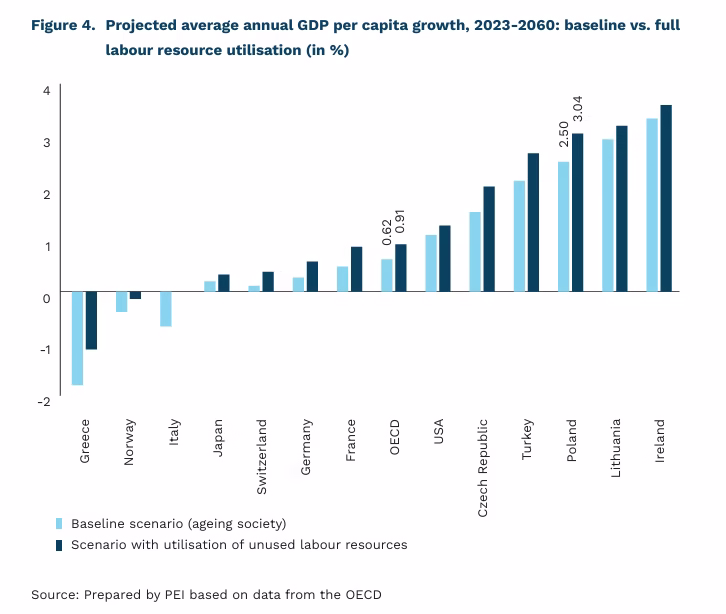 A key consequence of demographic ageing is the slowdown in GDP per capita growth. A declining population reduces labour input in the production of goods and services. At the same time, a smaller population mechanically inflates per capita GDP figures, as output is distributed across fewer individuals. In the baseline scenario (assuming continued demographic ageing), the average annual GDP per capita growth in OECD countries is projected at just 0.6% between 2023 and 2060. With better utilisation of untapped resources(2), this rate could rise by 0.3 percentage points. Poland stands out in the OECD in this regard. Its projected per capita GDP growth is 2.5% in the baseline scenario and 3% assuming resource mobilisation – the third-highest among OECD countries, after Ireland and Lithuania. This suggests that Poland could benefit significantly from structural reforms aimed at improving labour market participation and productivity.