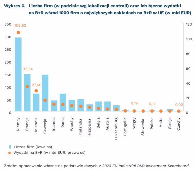 Wśród 2500 firm na świecie najwięcej inwestujących w badania i rozwój w 2022 r. znalazło się 367 z UE, które zainwestowały łącznie nieco ponad 219 mld EUR. To mniej niż firmy z Chin czy Stanów Zjednoczonych. Jednocześnie za ponad 70 proc. nakładów firm z UE odpowiadają firmy z trzech państw, tj. z Niemiec, Francji i Holandii.