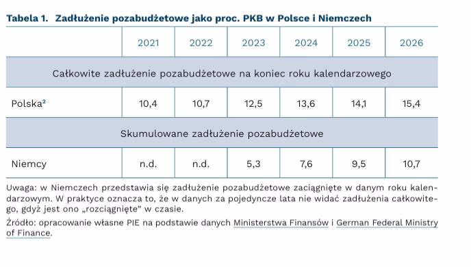 Zarówno pandemia COVID-19, jak i trwająca wojna w Ukrainie skłoniły rządy państw Unii Europejskiej do poszukiwania nowych sposobów finansowania potrzeb społecznych. W rezultacie zaczęto korzystać z tzw. funduszy pozabudżetowych. Mimo relatywnie niskiego, jak na warunki europejskie, zadłużenia publicznego, polski rząd również sięgnął po to narzędzie, głównie za pośrednictwem PFR oraz BGK. Łącznie wydatki publiczne zrealizowane za pośrednictwem funduszy pozabudżetowych w 2022 r. sięgnęły 324 mld PLN(1). W tabeli zaprezentowano porównanie skali stosowania instrumentów finansowania pozabudżetowego w Polsce i Niemczech. Ze względu na różnice w metodologii naliczania tego zadłużenia w obu krajach, w celach porównawczych prezentujemy wartości skumulowane dla Niemiec. Co istotne, na poziomie międzynarodowym brakuje ewidencji tego typu instytucji i skali kreowanych przez nie zobowiązań, dlatego zestawienie należy traktować jedynie poglądowo.