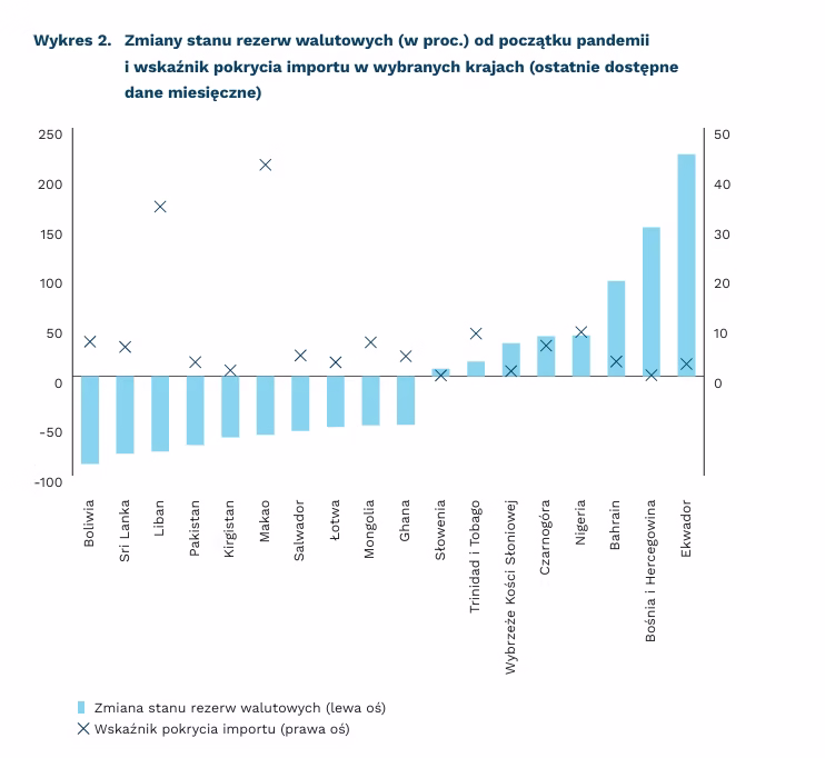 Największego spadku poziomu rezerw walutowych doświadczyły Boliwia (-88,9 proc.), Sri Lanka (-77,89 proc.) oraz Liban (-75,68 proc.). We wrześniu 2022 r. bank centralny Boliwii wykazywał rezerwy na poziomie zaledwie 372 mln USD, co jest równoznaczne z 0,825 pokrycia importu. Jest to efekt rosnącego deficytu fiskalnego (7,2 proc. PKB), który w dużej mierze jest finansowany pożyczkami banku centralnego. Z kolei najwięcej rezerw od początku pandemii udało się zakumulować Ekwadorowi (+223,57 proc.), Bośni i Hercegowinie (+150 proc.) oraz Bahrajnowi (+96,05 proc.). W Polsce stan rezerw (w walutach wymienialnych) zmniejszył się o 0,48 proc., co obecnie wystarcza na sfinansowanie 4,78 miesiąca importu.