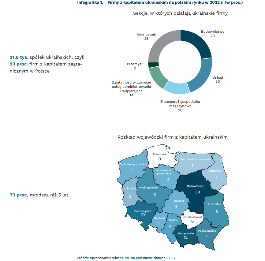 Spółki, w których jednym z udziałowców jest ukraińska firma lub osoba fizyczna posiadająca ukraińskie obywatelstwo stanowią 23 proc. działających w Polsce firm z kapitałem zagranicznym. Pod koniec stycznia 2022 r. w naszym kraju działało 21,8 tys. ukraińskich podmiotów, czyli ponad 2,5 razy więcej niż niemieckich i 5 razy więcej niż holenderskich. Największa część (38 proc.) ukraińskich firm była zarejestrowana w województwie mazowieckim, z czego większość w Warszawie. Zdecydowana większość ukraińskich firm liczy mniej niż 5 lat. Najwięcej z nich działa w sektorach budownictwa (23 proc.) i handlu (22 proc.), dość duży jest też udział przedsiębiorstw zajmujących się transportem (14 proc.) i działalnością w zakresie usług administrowania i wspierającą (13 proc), w których większość to agencje pracy tymczasowej i firmy świadczące usługi sprzątające.