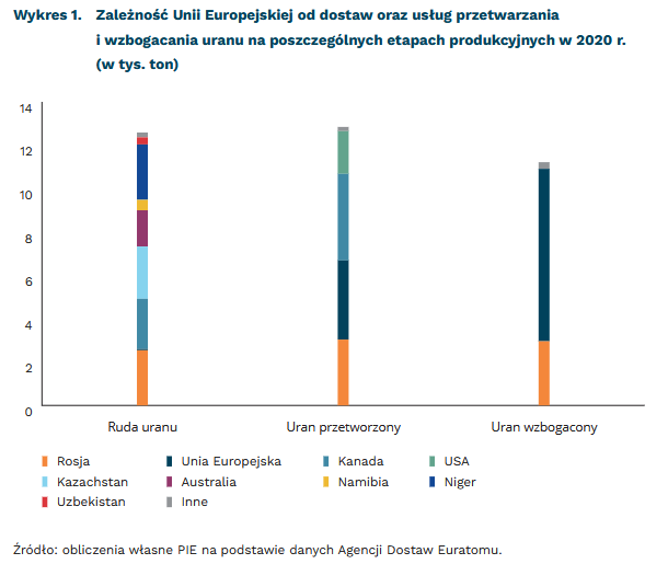 Państwa Unii Europejskiej zaimportowały w 2020 r. ok. 12,6 tys. ton uranu (ponad 97 proc. zapotrzebowania)21. Głównymi dostawcami rudy uranu były: Niger (20,3 proc.), Rosja (20,2 proc.), Kazachstan (19,2 proc.) Kanada (18,4 proc.) i Australia (13,3 proc.). W państwach UE przetwarzano 28 proc. sprowadzanego uranu. UE korzystała także z usług przetwarzania w Kanadzie (31 proc.), Rosji (24 proc.) i USA (15 proc.). Wzbogacanie uranu było realizowane w 71 proc. na terenie UE, a w 26 proc. w Rosji. Głównymi importerami rosyjskiego wzbogaconego uranu (ponad 94 proc. ogólnej wartości eksportu rosyjskiego uranu do UE) były: Szwecja (66,6 proc.), Holandia (13,2 proc.), Niemcy (12,6 proc.) i Francja (5,2 proc.).