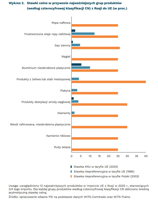 co najmniej 25 proc. wynosiły niepreferencyjne stawki w taryfie celnej Polski przed akcesją do UE w najważniejszych grupach towarów importowanych z Rosji