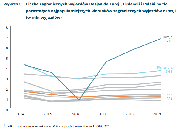 W ostatnich dwóch latach przed pandemią (2018 i 2019) i załamaniem międzynarodowego ruchu turystycznego odnotowywano 41 mln i 45 mln wyjazdów zagranicznych z Rosji. W pierwszym roku pandemii ta liczba spadła do ok. 12 mln. Wcześniej liczba podróżujących za granicę Rosjan odbudowywała się powoli po spadku wywołanym sankcjami po aneksji Krymu i wahaniami kursu rubla. W tym czasie władze w Moskwie zachęcały do turystyki krajowej, np. na zaanektowany Krym38.