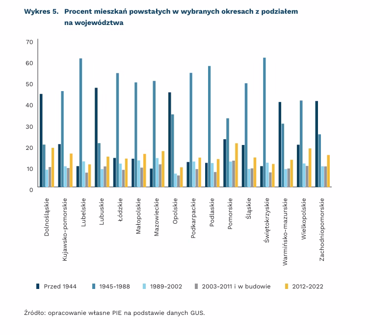 Wykres obrazuje jak duże wyzwanie w zakresie implementacji zapisów dyrektywy stoi przed Polską. Struktura mieszkalnictwa jest bowiem zdominowana przez budynki wieloletnie: w szczególności ściana zachodnia kraju cechuje się wysokim udziałem mieszkań powstałych przed 1944 r., zaś w ogólnym ujęciu dominująca liczba mieszkań w Polsce powstała w latach 1945-1988. Ponadto, do ogrzewania aż 4 mln domów w Polsce wciąż wykorzystywane są paliwa stałe, a aż 80 proc. przedsiębiorstw ciepłowniczych jest klasyfikowanych jako nieefektywne. Poważnym problemem społecznym pozostaje również kwestia ubóstwa energetycznego, którym zagrożone jest 12 proc. populacji Polski.