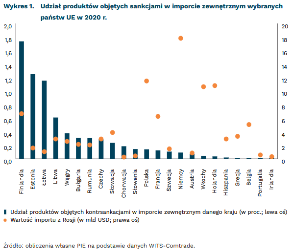 Udział produktów objętych rosyjskimi kontrsankcjami w polskim imporcie z Rosji w 2020 r. był niższy niż dla UE i wyniósł 1,4 proc. Wartość importu tych towarów była równa 162 mln USD. Stanowiło to zaledwie 0,14 proc. całego polskiego importu spoza UE. Większe znaczenie dla polskiego importu miały tylko trzy grupy produktów. W 2020 r. z Rosji pochodziło 8,1 proc. pozaunijnych dostaw do Polski taboru szynowego, 3,7 proc. wyrobów z drewna oraz 1,8 proc. sprzętu i aparatury precyzyjnej.