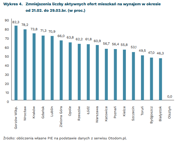 Biorąc pod uwagę grupę 18 największych miast w Polsce, najbardziej znaczący procentowy spadek liczby aktywnych ogłoszeń w okresie pomiędzy 21.02. a 29.03.br. zanotowano w: Gorzowie Wlkp. (o 82 proc.: odpowiednio z 62 do 11), we Wrocławiu (o 78 proc.: z 1392 do 304), w Krakowie (o 74 proc.: z 1969 do 515) oraz w Gdańsku i Lublinie (o 71 proc.: odpowiednio z 647 do 186 i z 292 do 85). W Warszawie spadek ten wyniósł 61 proc. (z 5468 do 2137), natomiast w pozostałych stolicach województw było to od 46 proc. w Białymstoku do 66 proc. w Zielonej Górze. Wyjątek stanowi Olsztyn, w którym liczba ofert była taka sama (43).