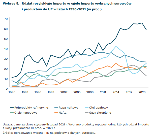 Rosyjska ropa naftowa stanowiła blisko 1/4 importu surowca do UE w 2021 r. (dane za I-XI 2021). Unia sprowadza z Rosji dodatkowo liczne produkty ropopochodne (35 proc. importu w kategorii „ropa i produkty ropopochodne”). Wśród nich wysoki udział stanowią półprodukty rafineryjne (58 proc.), olej opałowy (25 proc.), oleje napędowe (21 proc.), nafta (19 proc.) i ciekły gaz z ropy naftowej (12 proc.) (wykres 5).