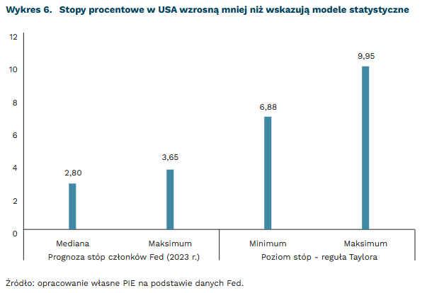 Modele statystyczne przeszacowują obecnie tempo wzrostu stóp procentowych w gospodarkach rozwiniętych. Oddział amerykańskiej Rezerwy Federalnej w Atlancie sugeruje, że bieżący poziom stóp zgodny z regułą Taylora sięga w USA blisko 6,5-9 proc.19. Dla porównania, bieżący wykres dot-plot, który obrazuje planowane podwyżki stóp procentowych przez władze monetarne sięga blisko 3 proc., a najbardziej jastrzębi członkowie spodziewają się wysokości mniejszej niż 4 proc. Prognozy wzrostu stóp powinny uwzględniać również ryzyko dla stabilności finansowej. Wzrost stóp procentowych do 7,5 proc. oznacza, że wysokość raty kredytowej dla kredytu o wartości 500 tys. sięgać będzie około 80 proc. średniego wynagrodzenia. Przy takiej wysokości część kredytobiorców zacznie mieć problemy przy regulowaniu bieżących zobowiązań – ostrzeżenie przed tym zagrożeniem już dziś formułują prezesi niektórych banków komercyjnych.