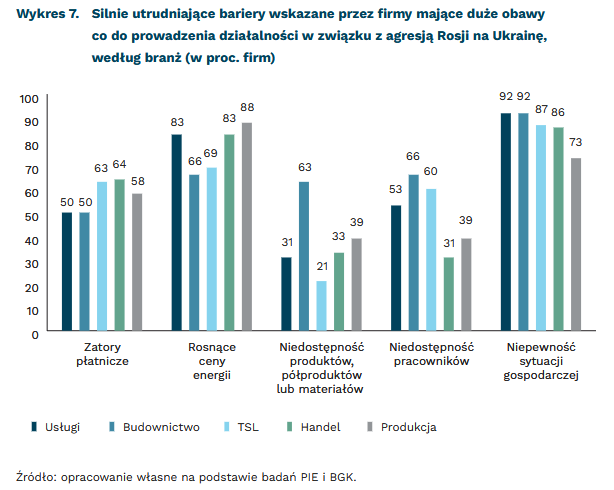 Aktualne obawy firm dotyczą różnych obszarów funkcjonowania przedsiębiorstw i z różnym natężeniem występują w poszczególnych sektorach gospodarki. Wśród firm mających duże obawy co do swojej działalności, w związku z trwającą wojną, szczególnie mocno eksponowany jest niepokój o przyszłą sytuację gospodarczą. Silnie odczuwają to firmy usługowe i budowlane (92 proc. wskazań). Istotne obawy dotyczą również rosnących cen energii, szczególnie uciążliwych dla produkcji (88 proc.), ale też dla handlu i usług (po 83 proc. wskazań). Firmy budowlane wiążą też swoje obawy z niedostępnością produktów, półproduktów i materiałów (63 proc.). Natomiast zatory płatnicze budzą niepokój przede wszystkim firm handlowych i transportowych (po 64 proc.). Dodatkowo podczas wojny pogłębił się problem z dostępnością pracowników, w szczególności w branżach zatrudniających przed wojną liczną grupę Ukraińców (budownictwo, TSL) – wykres 7. Niedobory pracowników związane są z obserwowanym po wybuchu wojny zjawiskiem powrotu mężczyzn do Ukrainy.