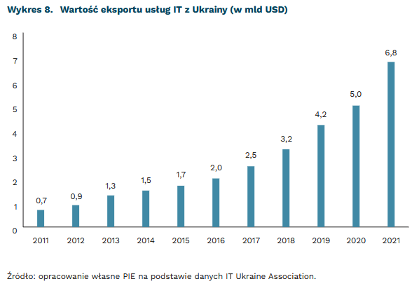 Przed wybuchem wojny ukraiński sektor IT był jednym z najszybciej rozwijających sektorów gospodarki – odpowiadał za ok. 4 proc. PKB, a usługi IT stanowiły największą kategorię eksportowanych usług (2,7 proc. eksportu). Ukraina mogła też pochwalić się kilkoma jednorożcami – młodymi firmami, wycenianymi na ponad 1 mld USD, w tym dwoma wycenianymi na ponad 10 mld USD35.