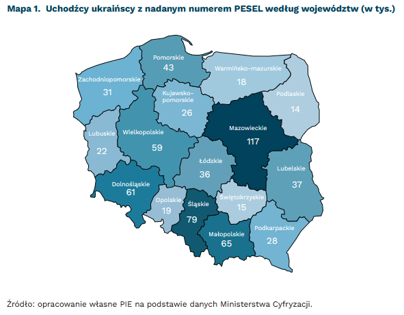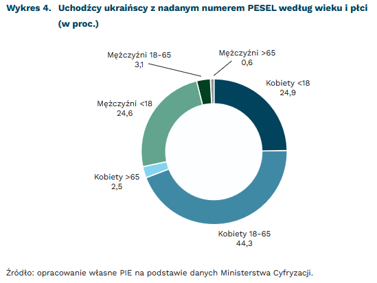 Liczba ukraińskich uchodźców, którym nadano numer PESEL, od dnia wejścia w życie ustawy o pomocy obywatelom Ukrainy z dn. 12 marca 2022 r., wynosi już 668 tys. (stan na 04.04.2022 r.). Połowę (49,5 proc.) tej grupy stanowią dzieci obojga płci łącznie (330 tys. osób). Osoby w wieku produkcyjnym (18-64 lata) stanowią 47,4 proc. (316 tys.), z czego zdecydowana większość (296 tys.) to kobiety. Mniejszość zarejestrowanych – 3,1 proc. (20,7 tys.) stanowią seniorzy, czyli osoby w wieku poprodukcyjnym.