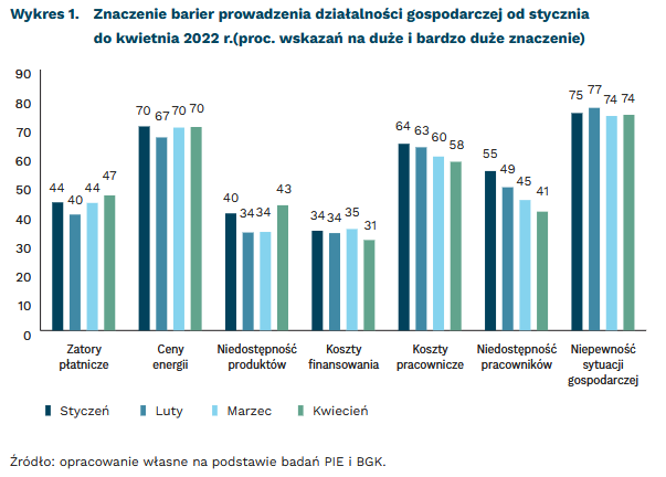 Znaczenie poszczególnych barier prowadzenia biznesu wynika ze splotu wielu czynników. Z jednej strony jest to nadal efekt kryzysu postcovidowego (zerwane łańcuchy dostaw, zaburzony rynek pracy, zdestabilizowane lockdownami procesy wydobycia i produkcji), a z drugiej – to nieuchronna konsekwencja obecnej sytuacji geopolitycznej. Wojna w Ukrainie może wpłynąć na dalszy wzrost znaczenia barier będących jej bezpośrednią konsekwencją, prawdopodobnie w kolejnych miesiącach na czele wskazań nadal będzie się niepewność sytuacji gospodarczej i rosnące ceny energii. Wysoce prawdopodobne jest też zwiększenie problemów z niedostępnością produktów.