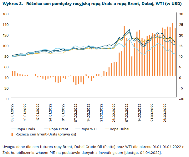 Od początku agresji rosyjskiej na Ukrainę wartość ropy rosyjskiej spadła o ponad 13 proc. (z 95 USD do 81 USD za baryłkę). W tym okresie średnia wartość ropy Brent, Dubaj i WTI wzrosła o 8 proc. (z 95 USD do 102 USD za baryłkę). Ponad pięciokrotnie wzrosła wartość różnicy cen między ropą Urals a europejską ropą Brent (z 4 USD do 23 USD za baryłkę). Rosyjska ropa znajduje coraz mniej nabywców, co przekłada się na jej znacznie niższą cenę na światowych rynkach.