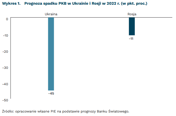 Wojna pochłonie nawet połowę wartości ukraińskiej gospodarki. Bank Światowy wskazuje, że wojna obniży PKB Ukrainy o 45 proc. To zachowawcza prognoza, bowiem instytucje międzynarodowe często zaniżają skalę wydarzeń skrajnych. Jeszcze niedawno walki toczyły się na terytorium odpowiedzialnym za 55 proc. produkcji w ukraińskiej gospodarce. Dla kontrastu, Bank Światowy szacuje, że PKB Rosji skurczy się jedynie o 11,2 proc.