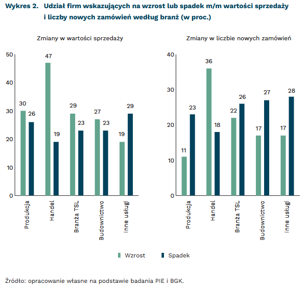 Wzrost liczby nowych zamówień m/m odnotowały głównie firmy handlowe (36 proc.). To jedyna branża, w której udział wskazujących na wzrost był wyższy niż przedsiębiorstw z odnotowanym spadkiem nowych zamówień (18 proc.). Jest to skutek dynamicznie rosnącego popytu na produkty zgłaszane przez konsumentów, których liczebność istotnie wzrosła w naszym kraju w związku z napływem uchodźców z Ukrainy.