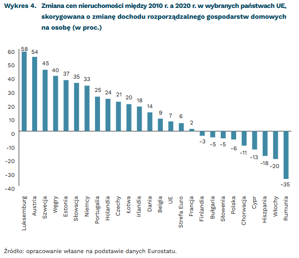 Od 2010 r. do 2021 r. średnie ceny nieruchomości w UE wzrosły o 42 proc. W dotkniętych kryzysem gospodarczym krajach Europy Południowej ceny nieruchomości utrzymują się na niższym poziomie niż w 2010 r. Największe wzrosty dotyczą niedużych państw położonych w Europie Środkowej (w Estonii jest to prawie 2,5-krotny wzrost cen). Polska ze średnim wzrostem 40 proc. plasuje się więc nieznacznie poniżej średniej unijnej.