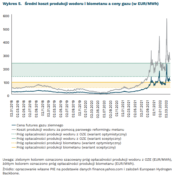 Utrzymujące się wysokie ceny gazu ziemnego w Europie będą nadal zwiększać względną opłacalność jego odnawialnych substytutów. Średnie ceny gazu na holenderskim hubie TTF w I kwartale 2022 r. wynosiły 100,8 EUR/MWh i były ponad 5-krotnie wyższe niż w analogicznym okresie 2021 r. i 10-krotnie wyższe niż w 2020 r.5. Przy stabilnych cenach powyżej 50 EUR/MWh (90 EUR/MWh według bardziej pesymistycznych szacunków)6 konkurencją dla gazu ziemnego staje się biometan, a zielony wodór, pochodzący z elektrolizy wody przy użyciu energii ze źródeł odnawialnych, zaczyna wypierać wodór produkowany w technologii reformingu parowego gazu ziemnego7. Przy cenach gazu powyżej 133 EUR/MWh zielony wodór może stać się tańszym paliwem od gazu ziemnego8.