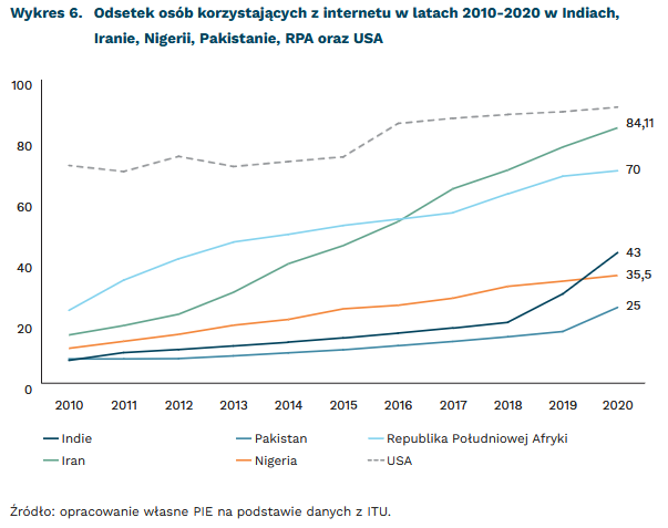 Odsetek osób korzystających z internetu w ww. krajach dynamicznie rośnie25, a zmiany demograficzne i wzrost liczby internautów w krajach globalnego Południa będą należały do kluczowych czynników wpływających na rozwój i charakter internetu w najbliższych dekadach. Odsetek Europejczyków wśród internautów znacząco zmniejszy się do 2050 r.26. Wspomniane kraje, których ludność jest adresatem rosyjskich kampanii propagandowych, są państwami o dużym potencjale ludnościowym. W 2020 r. w Indiach żyło ok. 1,4 mld osób, w Pakistanie – 221 mln, w Nigerii – 206 mln, w Iranie – 84 mln, a w RPA – 59 mln27 (co łącznie odpowiadało jednej czwartej światowej populacji), a współczynnik dzietności jest tam na znacznie wyższym poziomie niż w krajach europejskich.