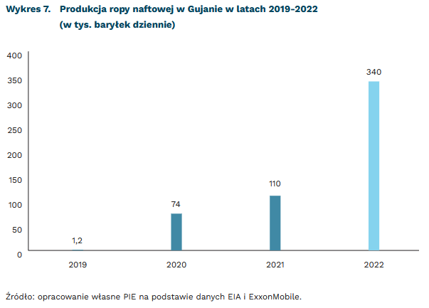 W 2022 r. Gujana – niewielki kraj w Ameryce Południowej – może znaleźć się w pierwszej dwudziestce największych eksporterów ropy naftowej na świecie. W ostatnich trzech latach wartość eksportu paliw mineralnych z Gujany odznacza się dużą dynamiką wzrostu. Od czasu rozpoczęcia wydobycia ropy w 2019 r. wartość eksportu tego surowca wzrósł z poziomu 8,2 mln USD do 2933,4 mln USD w 2021 r. W 2022 r. planowane jest potrojenie poziomu wydobycia ropy: ze 110 tys. baryłek w 2021 r. do 340 tys. (dla porównania dzienne wydobycie USA – największego producenta ropy na świecie – w 2020 r. wynosiło 18,61 mln baryłek). Dzięki najnowszym odkryciom rezerwy ropy naftowej Gujany szacuje się na 10 mld baryłek30, co plasuje ten kraj w pierwszej dwudziestce na świecie.